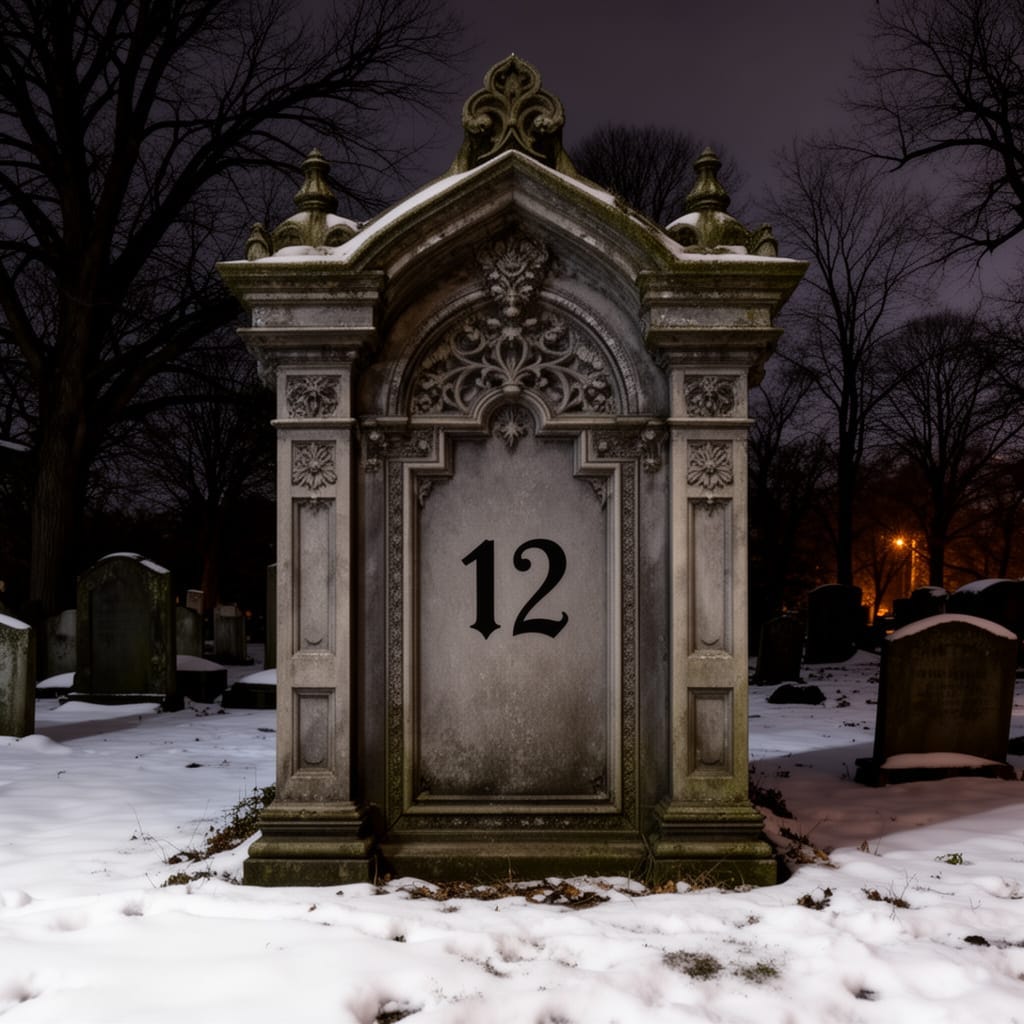 Got free, ‘cept I’m staggering and kin barely shuffle. He’s rattling about ‘aving a go at climbing t’ gates, ‘cept wiv his arm fecked up he ain’t gettin on too well. I just keep me mind on threading me way past the gravestones. I got the Wake mausoleum close in sight when I hear t’ gates rattle and bang. Always liked how it stands all by its lonesome like t’ dead don’t wanta be seen near it. I got my hand up ta touch t’ door when he runs up behind me, grabs me neck from behind and smashes me face into a goodly thickness of immovable marble at the same time the clock ‘cross t’ river strikes the midnight hour.